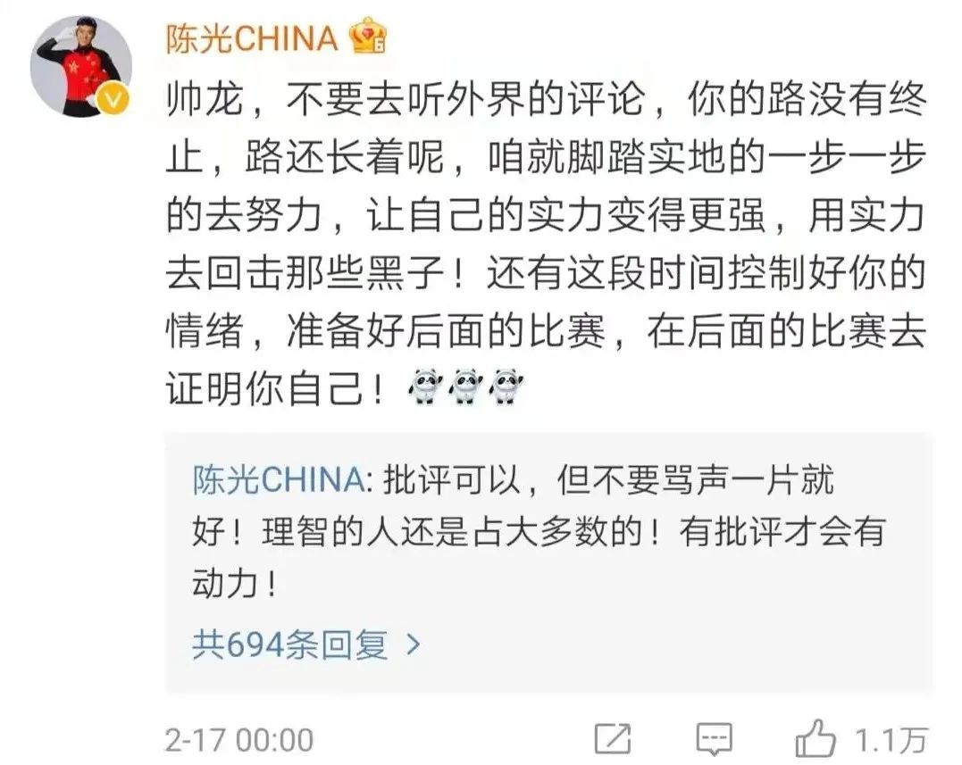 同是短道速滑队员的林孝埈、陈光也发声为孙龙加油鼓劲: