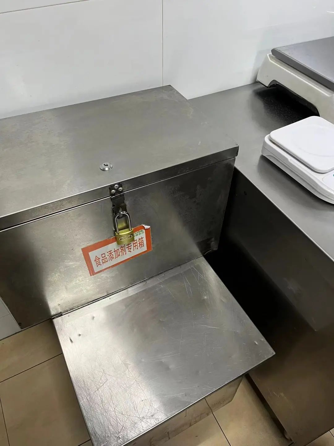 走进学校食堂后厨,执法人员对于食堂工作人员资质情况如何、冷冻柜温度是否符合贮藏要求、冷柜里的商品有效期如何等等情况进行逐项检查。为了让孩子们吃得更安全,餐食中对于食品添加剂需要严格管控。记者在学校食堂看到,食品添加剂设置了专用箱,并用锁头锁牢。每次使用添加剂,需要精准称量,并将此登记在案。执法人员对于登记的账册情况详加查看。