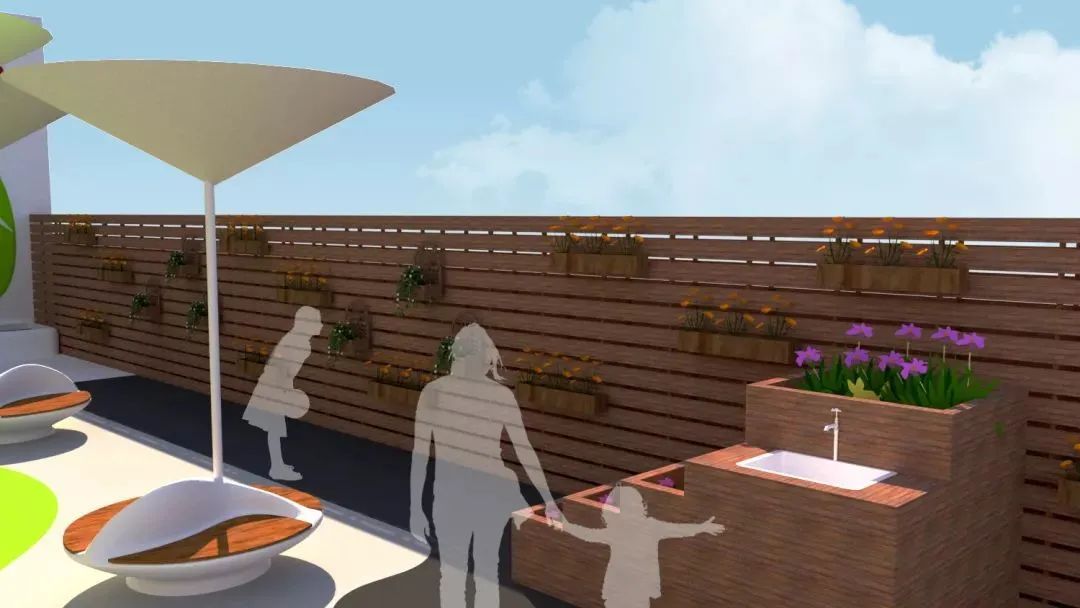 通过对雨水的收集,将海绵社区的理念融入花园。雨水来源主要有三个:一是花园中心的雨水收集器,二是透水路面,三是楼顶积存雨水。这三个来源的雨水,通过各自管道或者透水路面,汇集到地下的蓄水池,经过过滤、净化装置,重新回到地面供花园使用。雨水的再利用体现在三个区域,鱼菜共生的供水,植物灌溉,以及洗车。