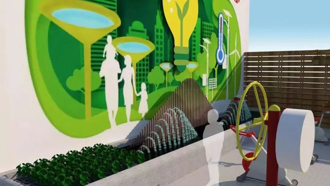 针对社区儿童和青少年较多的情况,在这块区域设置了几台像传统健身器材的装置,实际上他们不仅可以起到健身效果,还可以与花园的雨水系统产生互动。比如,通过转动灌溉装置,可以将水从集水池抽到地上、进而对前面介绍的绿化观赏区进行浇水、灌溉;通过踩单车,可以将水从地下抽到水池中,并形成喷泉景观,该区域不仅具备休闲娱乐的用途,还具备一定的科普性,小朋友们可以从各种设备的使用中了解到一定的科学知识,获得科学启发。