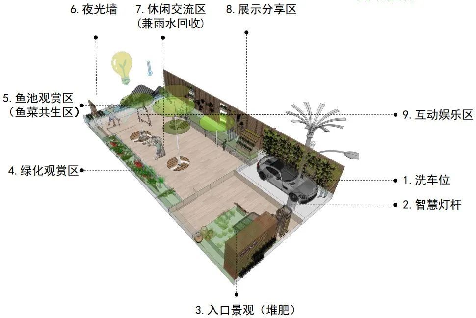 低碳花园整体分为了8大功能区:①雨水洗车区;②智慧灯杆;③入口景观区(兼具堆肥);④绿化观赏区;⑤鱼菜共生区;⑥夜光展示墙;⑦休闲交流区(雨水回收);⑧展示分享区。