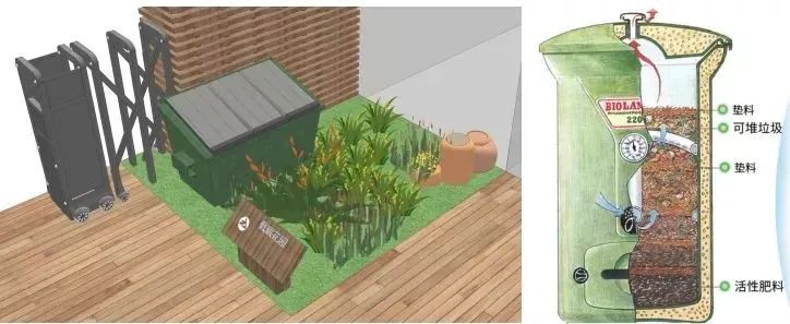 配合上海目前垃圾分类工作的开展,四类垃圾中能够在小区内自己循环利用的就是湿垃圾。因此,在花园入口处设置垃圾堆肥箱,可以将小区内的树叶、树枝等园林垃圾放入其中,转化为酵素肥料,同样居民可以通过参与小区自治活动来换取酵素肥料。