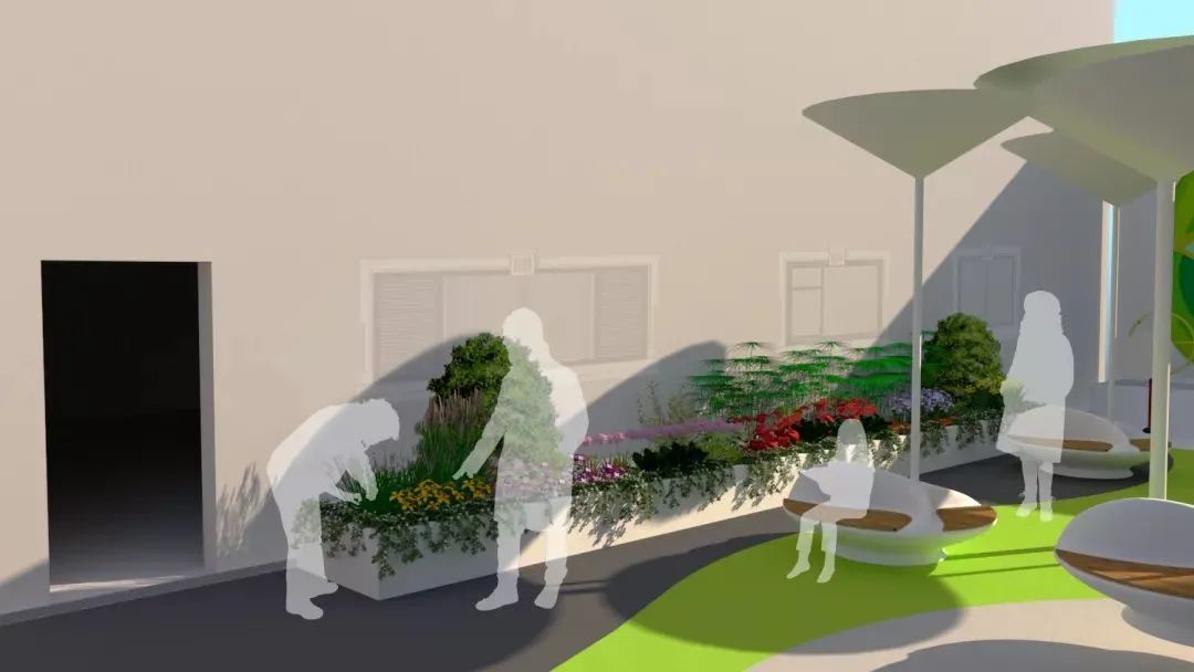 由于花园空间周围被住宅围绕,且建筑间间距较小,这片区域是花园内为数不多的采光较好的区域。因此将这块区域设计为绿化观赏区,而这片区域的灌溉会与居民的互动结合在一起。