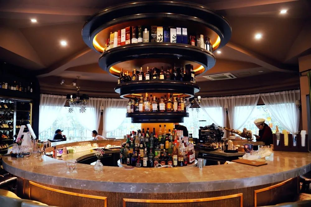这是一家藏在长寿公园内的咖啡馆,闹中取静,名字也很特别,取名为“蓉”。一座圆形的建筑,半圈被银杏树环绕,室外小花园,有露天的座位。室内装饰精致而古朴,中间是360度开放式圆形环绕吧台,摆满了酒和机器,四周落地窗,环窗一圈都是景观位,到了晚上摇身一变,成了非常浪漫的酒吧。