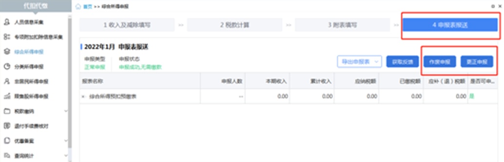 可点击【首页】,选择要更正的【税款所属月份】- 【综合所得申报】/【分类所得】/【非居民所得】- 【申报表报送】- 【更正申报】,启动更正后就可以修改数据重新申报了,之后返回【收入及减除填写】界面修改数据,再进行【税款计算】,修改后全员全额重新申报。