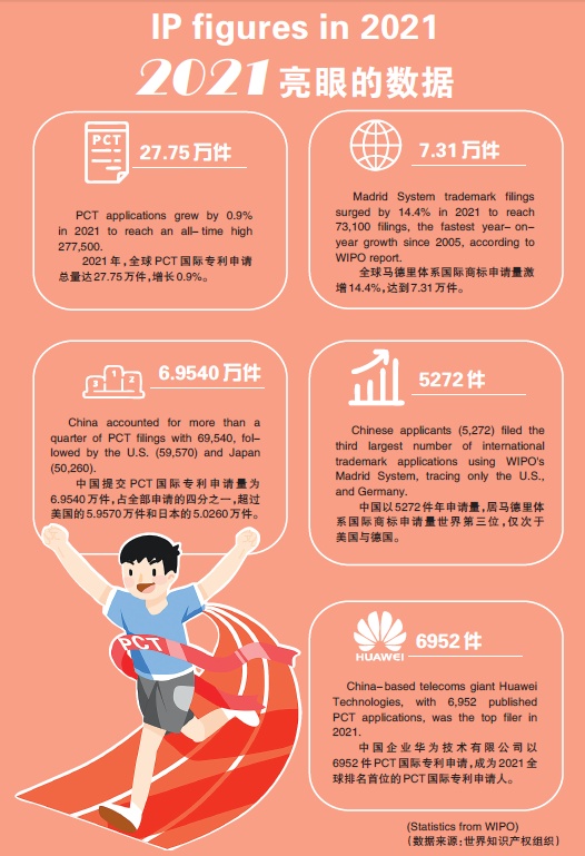 The World Intellectual Property Organization (WIPO) issued statistics on patent, trademark and designs in 2021 on February 10. China remained the largest user of the International patent applications filed via WIPO's Patent Cooperation Treaty (PCT) in 2021, pacing the world for three consecutive years since 2019, according to a report issued by WIPO.