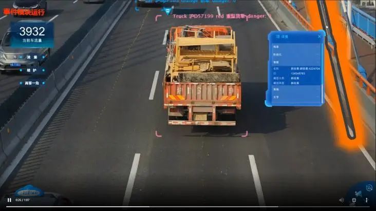 为掌握大桥交通数字体征,全桥共设置交通感知设备约10类200套,包括视频监控、动态称重、气象、车流量检测及边缘计算分析等设备,实时掌握桥面车辆运行实况并自动识别桥面异常事件;运用车辆模型的动态模拟软件,实现大桥上的车辆动态孪生仿真,并对其中需要关注的营运车辆保持全程跟踪,为运输管理提供直观、高效的数据支撑系统。