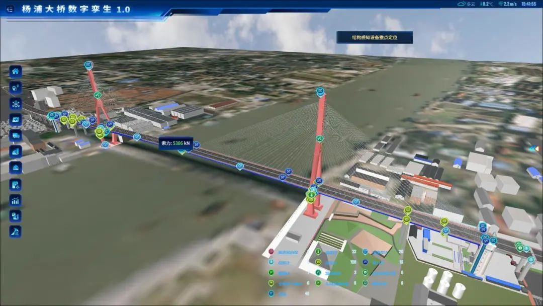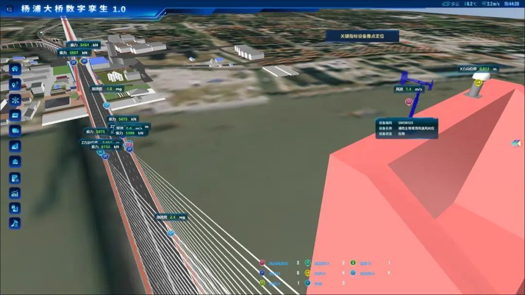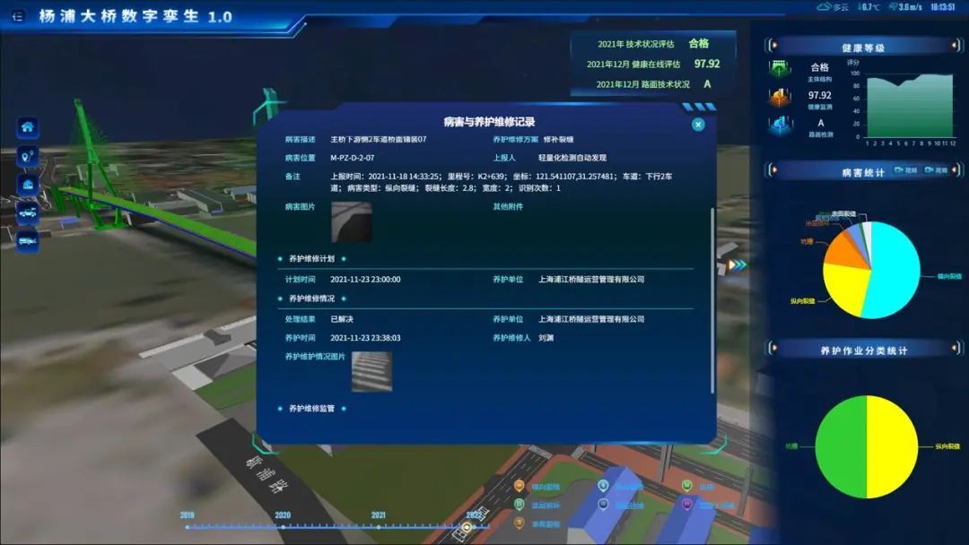 数字孪生对定期技术状况评定、结构健康监测和路面平整度等全方位的基础数据进行了整合,实现了大桥运行状态的实时动态评估。