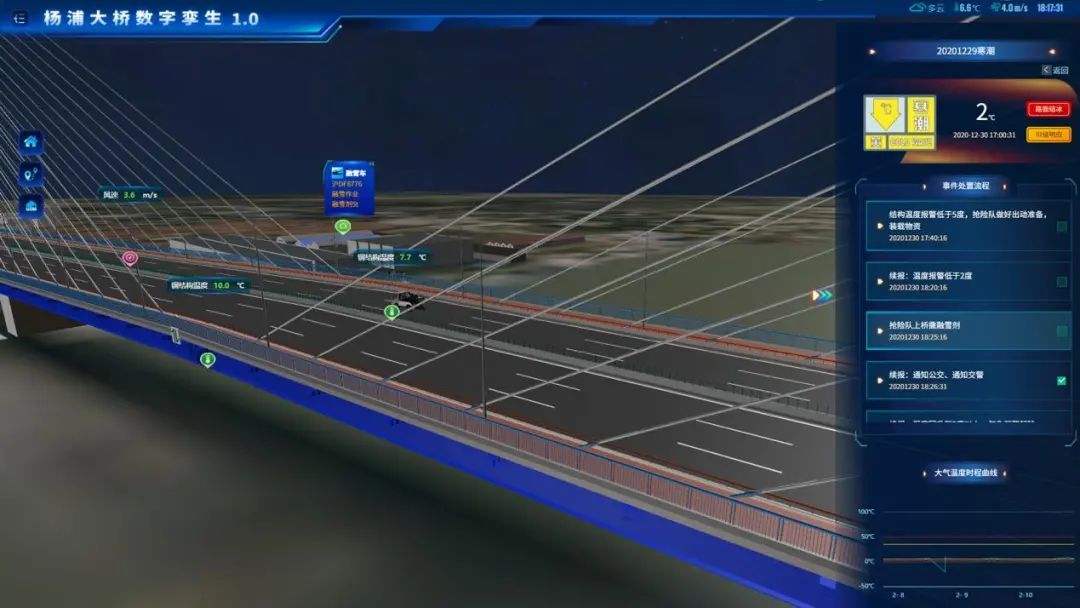 通过对大桥应急处置全程跟踪、指导、监管,辅助现场快速处置,预防影响交通及设施安全的重大事件的发生。低温雨雪天气时,当气象部门发布黄色预警时立即启动应急响应,基于现场实时环境、结构温度感知数据,展开应急响应准备、物资自动匹配、融雪作业启动、车辆安全提示、事后检测回顾等的闭环管理。