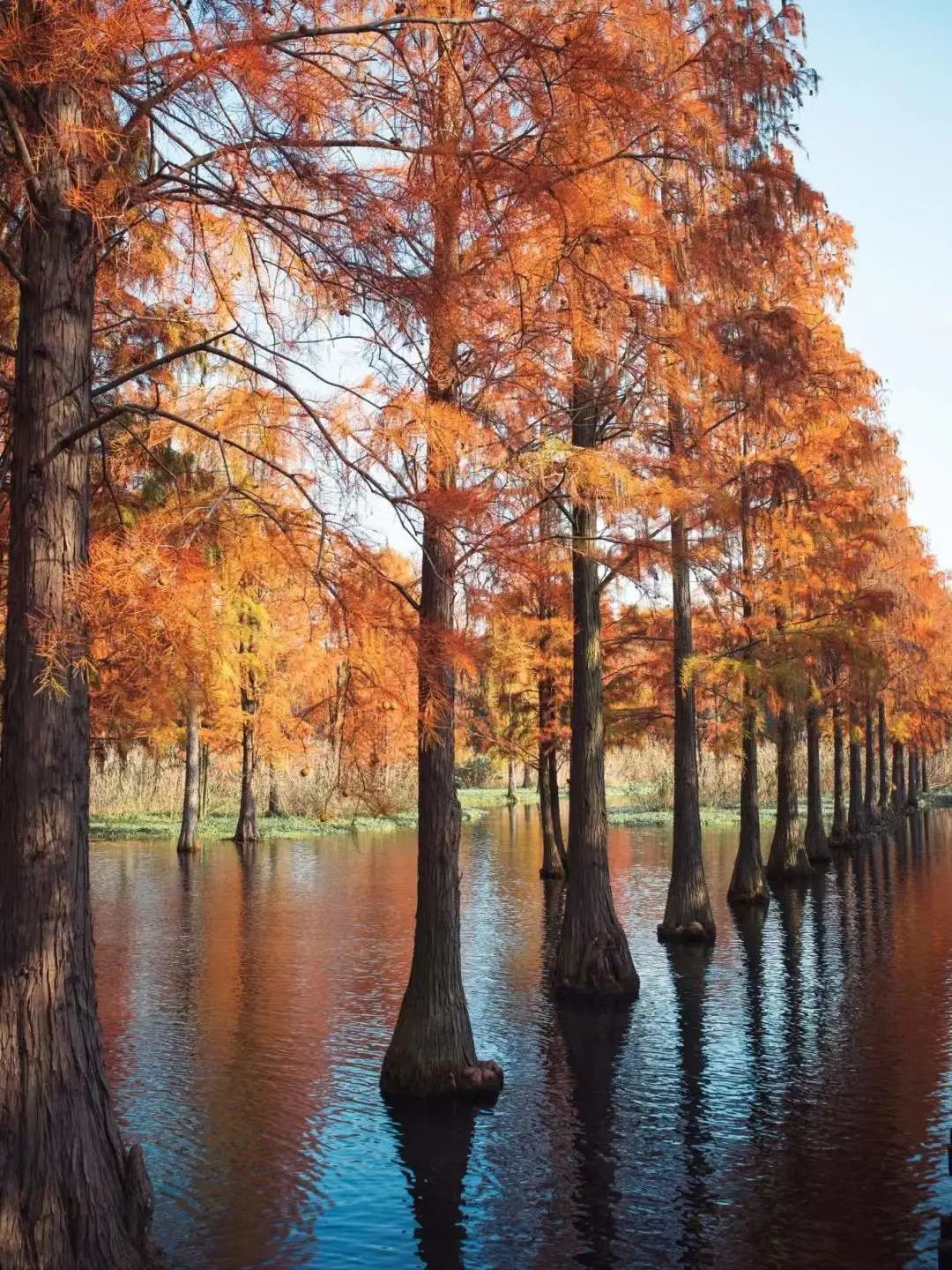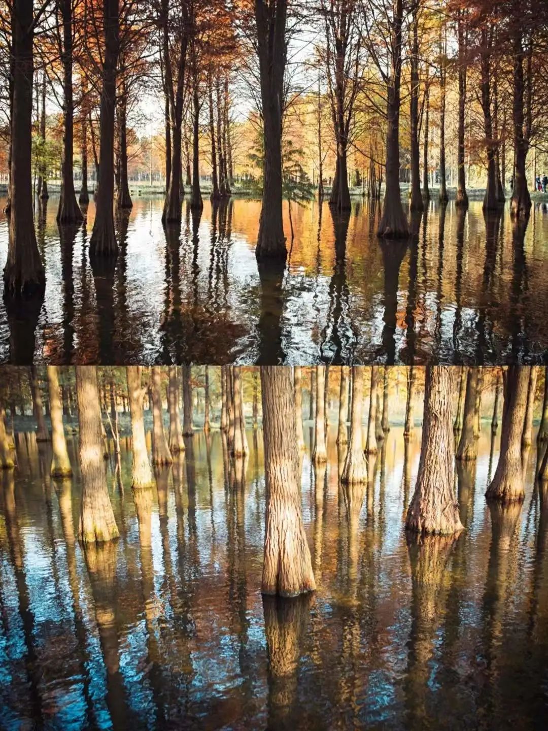 落羽杉和中山杉与湖光相映,端庄优美的树姿倒映在水中那种美着实惊艳。这片水上森林,让你仿佛置身于莫奈画中……
