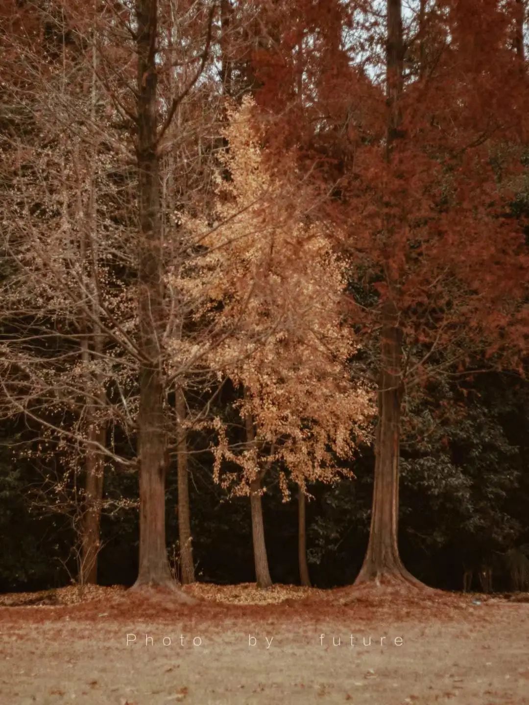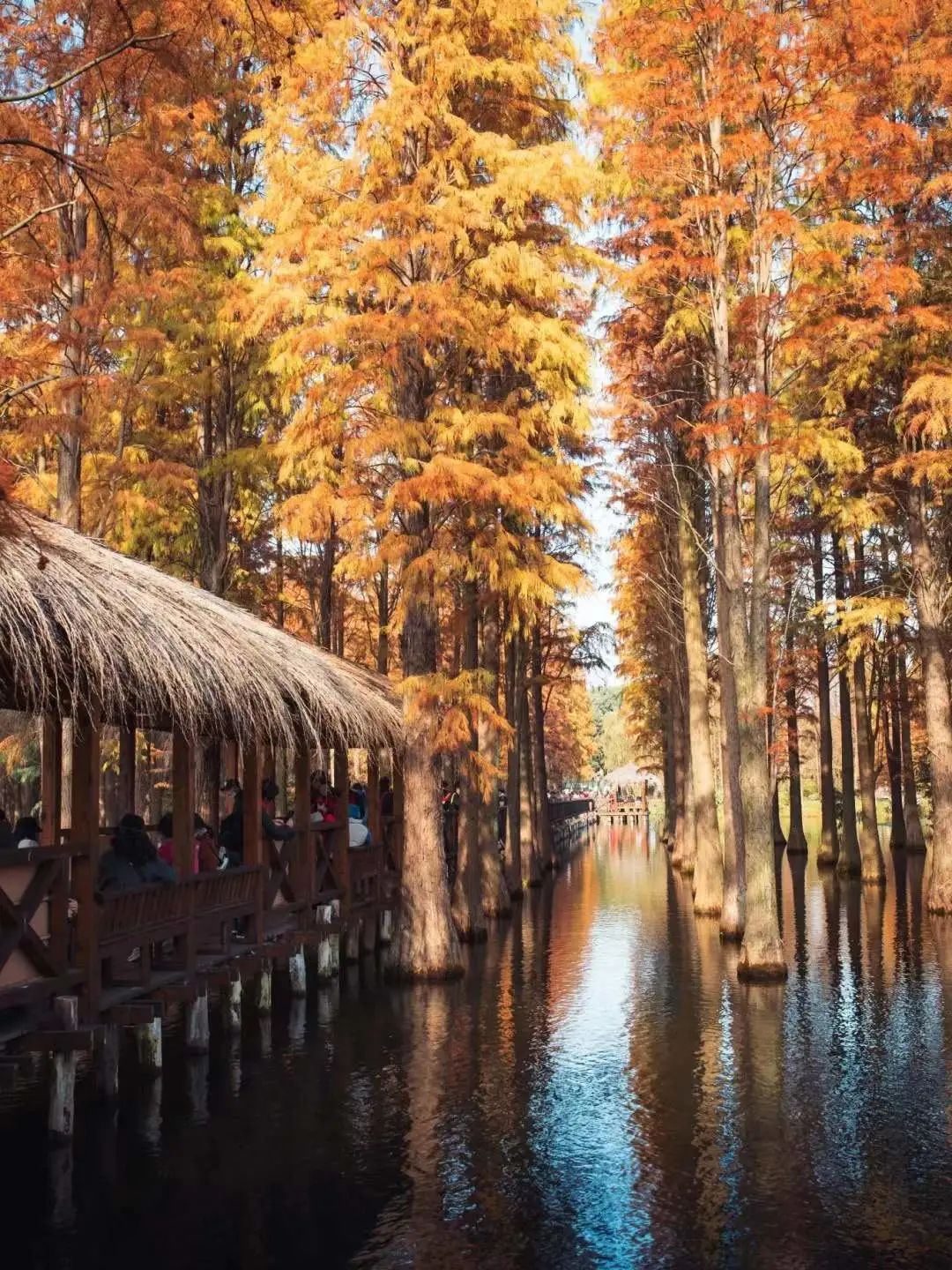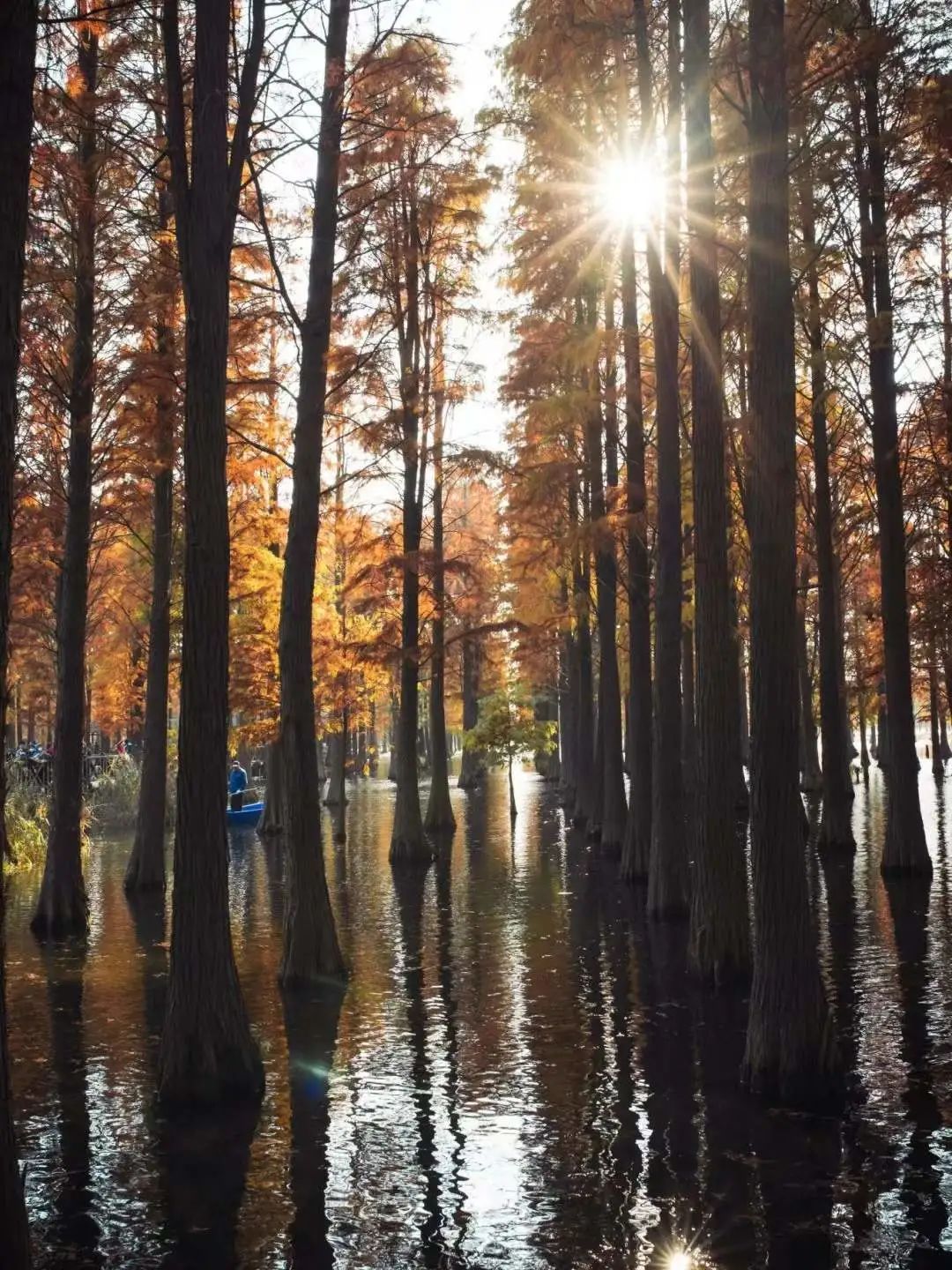 12月后,翠绿“换装”成一袭赭红色,暖阳映在水面上,波动的涟漪和缤纷的色彩,就像一幅幅莫奈的画作。