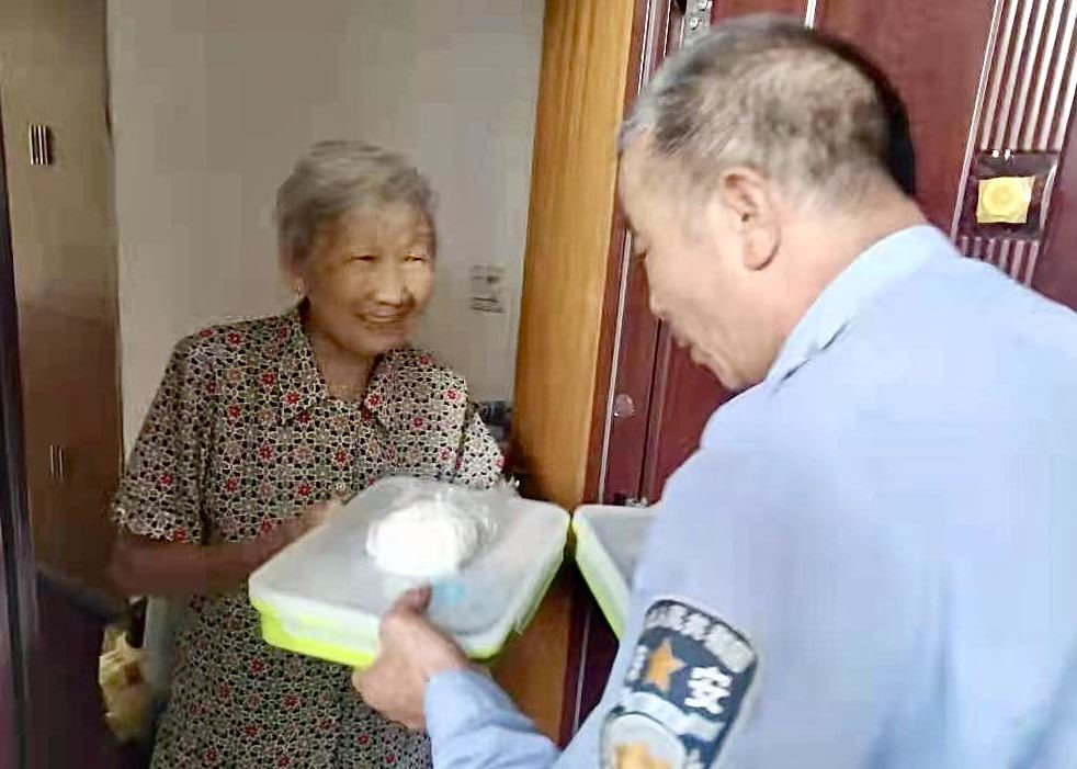 今年90岁高龄的曹爱英,子女都居住在市区,且同样年事已高,往来不便。于是山水景苑居委会协调小区的9名保安人员,他们承担起了小区的爱心接力送餐工作,让两名高龄独居老人足不出户就能吃上“放心餐”“暖心饭”。