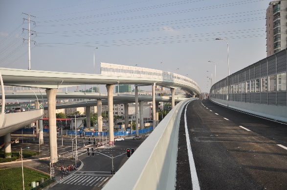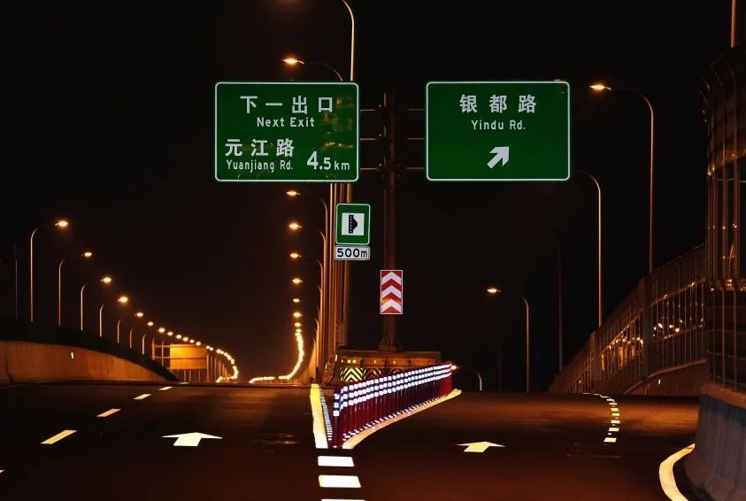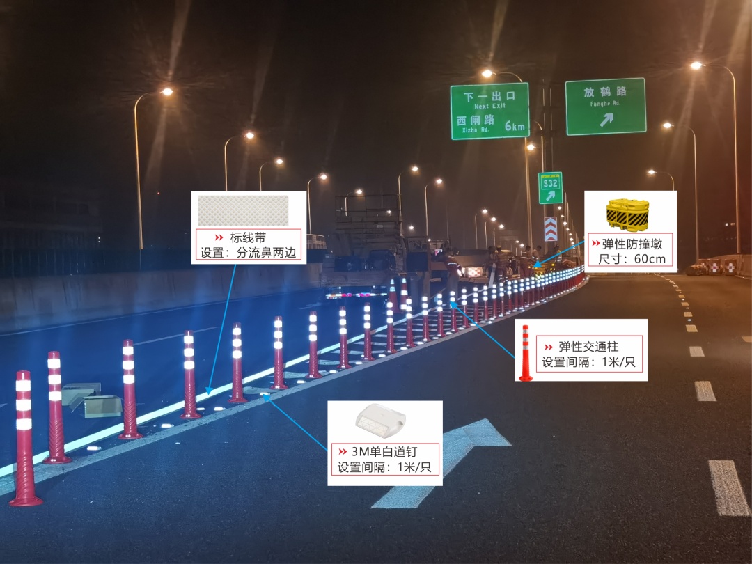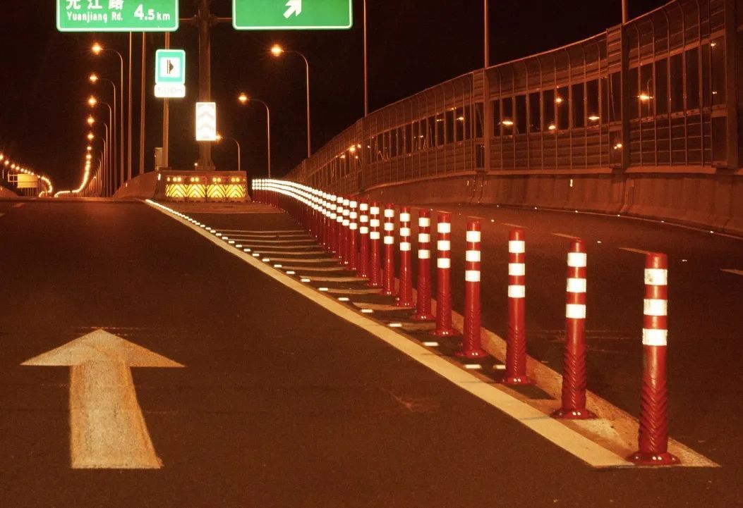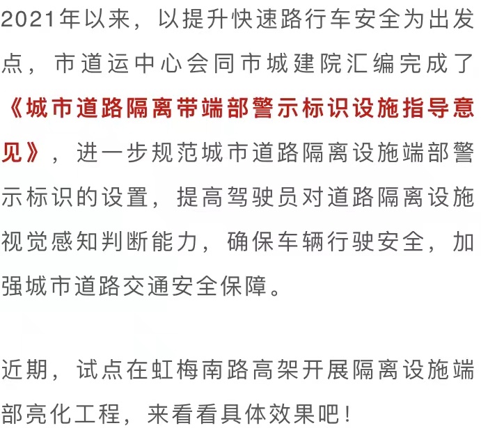 本次虹梅南路高架道路隔离设施警示标识的安装遵循了绿色低碳、简约环保、经济耐久的原则,采用高性能的逆反射材料,选用耐弯折易养护的警示柱,降低维护成本;施工上采用成熟的胶粘方式或胶粘辅助方式,减少对路面的损害;采用全方位立体化设计和施工,警示效果显著,同步提升了全天候的养护理念。