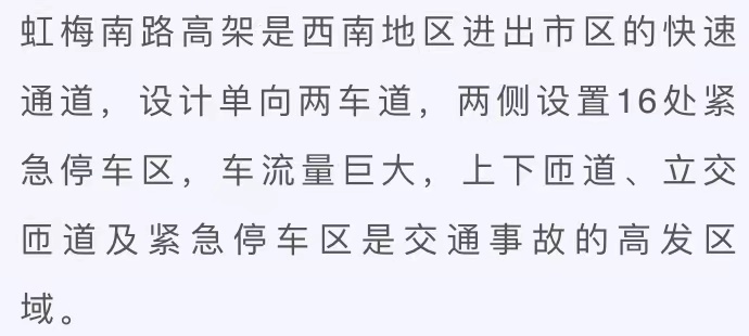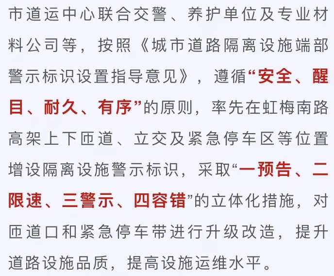 根据虹梅南路高架交通流量需要及设施特点,共在上下匝道、立交处斑马线及紧急停车带等位置增设突起路标1620只、白色IES标线带1369米、防撞桶116只、交通反光柱560个、钻石级标志牌9个、导向箭头及太阳能反光交通柱11套,为虹梅南路高架在夜间换上了“亮”丽新装,有效降低了事故发生率。