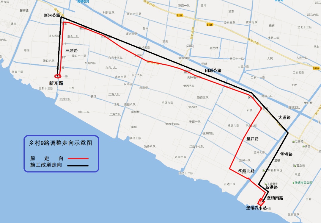 调整后行驶走向:堡镇汽车站起经堡镇南路、新港路、堡港路、大通路、团城公路、新河公路、三烈路至新东路。