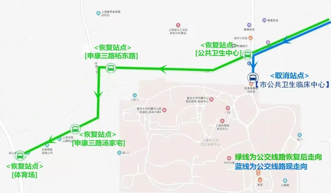 恢复后线路走向:自山阳小学始发,经山南路、华山路、红旗东路、龙皓路、海丰路、龙航路、亭卫公路、南阳港西路、山海路、山通路、中甸路、柘阳路、长兴村路、申康一路、长兴路、拓东路、申康三路、柘东路至体育场。