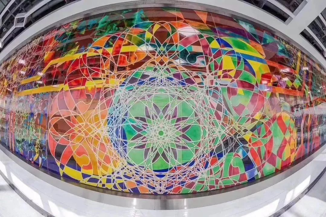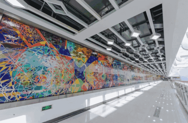 站内设计采用了白色的背景结合LED灯,透明棚顶又将自然光引入,整体非常敞亮。配以智能灯光控制系统,看起来就充斥着满满的科技感!它最引人注意的是装饰了《诸光开物》的一大片艺术墙。