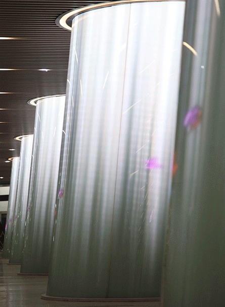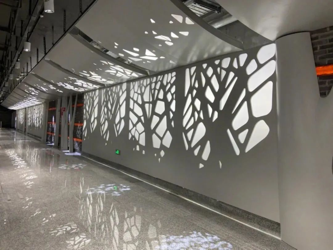 因为这一带的树木皆是梧桐树,所以站内都是抽象的梧桐树造型,不过最绝的是树影灯的应用,营造出了地面环境中绿树成荫、树影斑驳的感觉。谁说地下世界不能有“阳光”呢!