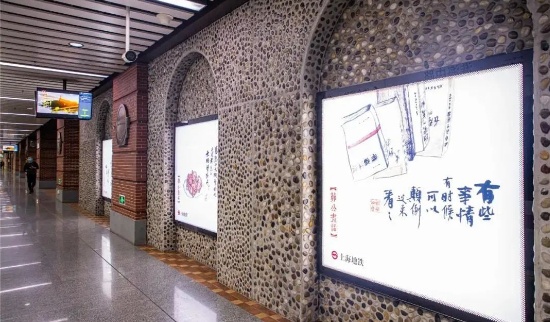 老上海的卵石墙、红砖墙、小地砖、古铜站牌……站内满是海派风情,目光所及之处,都是上海宁的记忆。站台两侧还有专属怀旧长廊,展示着淮海路周边的历史建筑及旧照。
