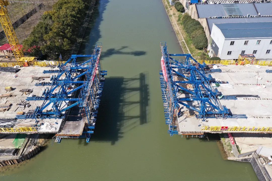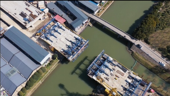桥梁于2020年开工建设,目前,桥梁两侧的东西引桥已经全部架梁完成。主桥合龙预计将在六月底实施,待完成桥面上的辅助工程和铺装层的施工后,预计能在七月底全部竣工。