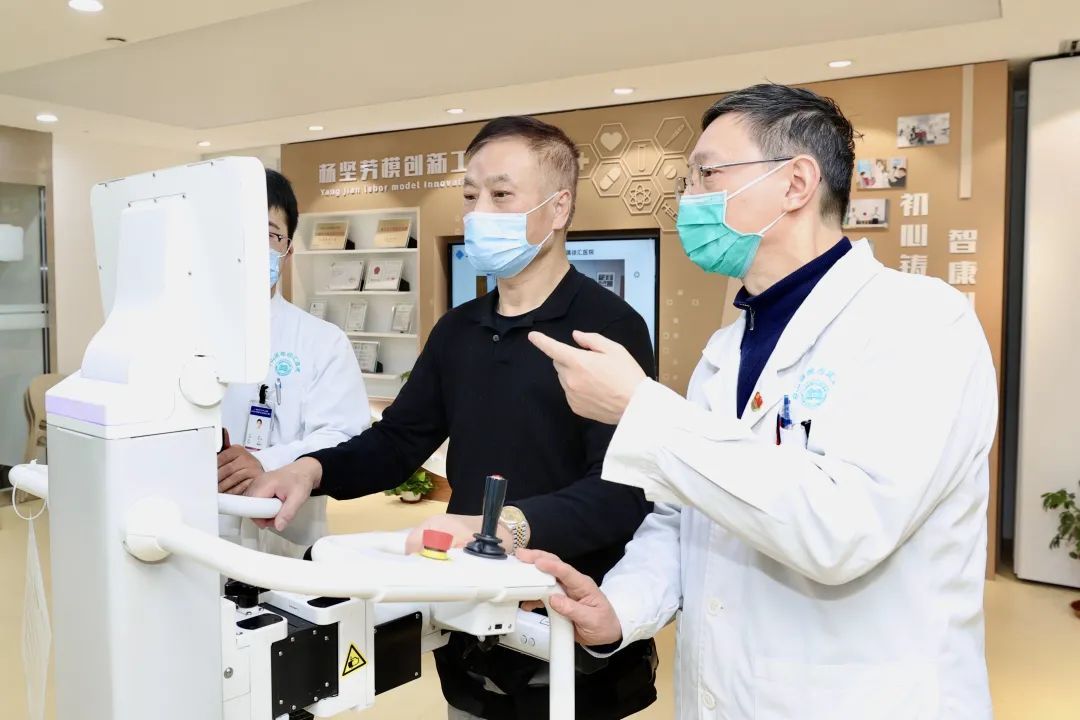 来到徐中心四楼杨坚劳模创新工作室,遇见杨坚主任正指导康复师如何运用人工智能下肢机器人帮助患者下肢康复。眼前66岁的男士中风后来到徐中心康复科,从完全瘫在床上举步维艰,两周不到在系统康复后已经能“亦步亦趋”平稳走动了。