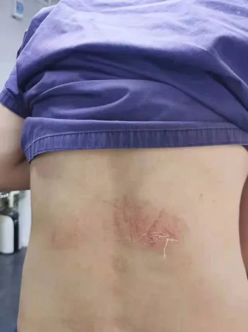 由于紧急跳窗,刘琦背部被擦伤。受访者供图