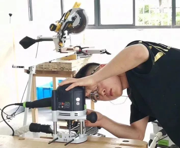 比赛当天,场地上锯声齐鸣、木屑飞舞。顶着寒冷的天气,戴着耳机和护目镜的吴晋卿冷静沉着:身处紧张的氛围,测量、切割、打磨、组装一气呵成......