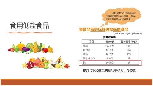 选购包装食品,要阅读营养成分表,选择钠含量低的食品,即食用低盐食品。营养成分表中“钠”超过500mg的食品要少买、少吃!