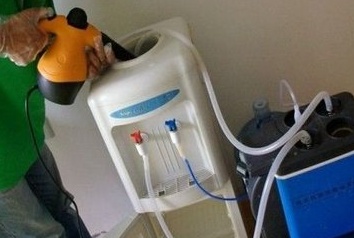 定期消毒饮水机内部手无法触及的部位:用消毒剂对饮水机内胆进行浸泡消毒,消毒后排尽消毒液,用纯水彻底冲洗饮水机内胆,直至闻不到消毒剂味道。