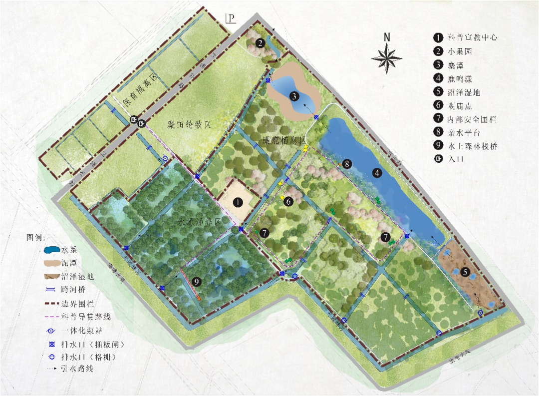 整个项目占地300多亩,被划分为麋鹿栖息区、麋田(轮牧)区、隔离区、水源涵养区和科普宣教区5大功能区。