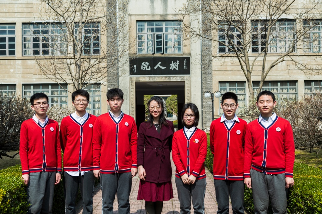 “云翎队”合影。左起:鲁正鑫、马晨瑜、王乐骋(队长)、徐蓓蓓(指导老师)、余秋瞳、周宇亮、冯顾炜。