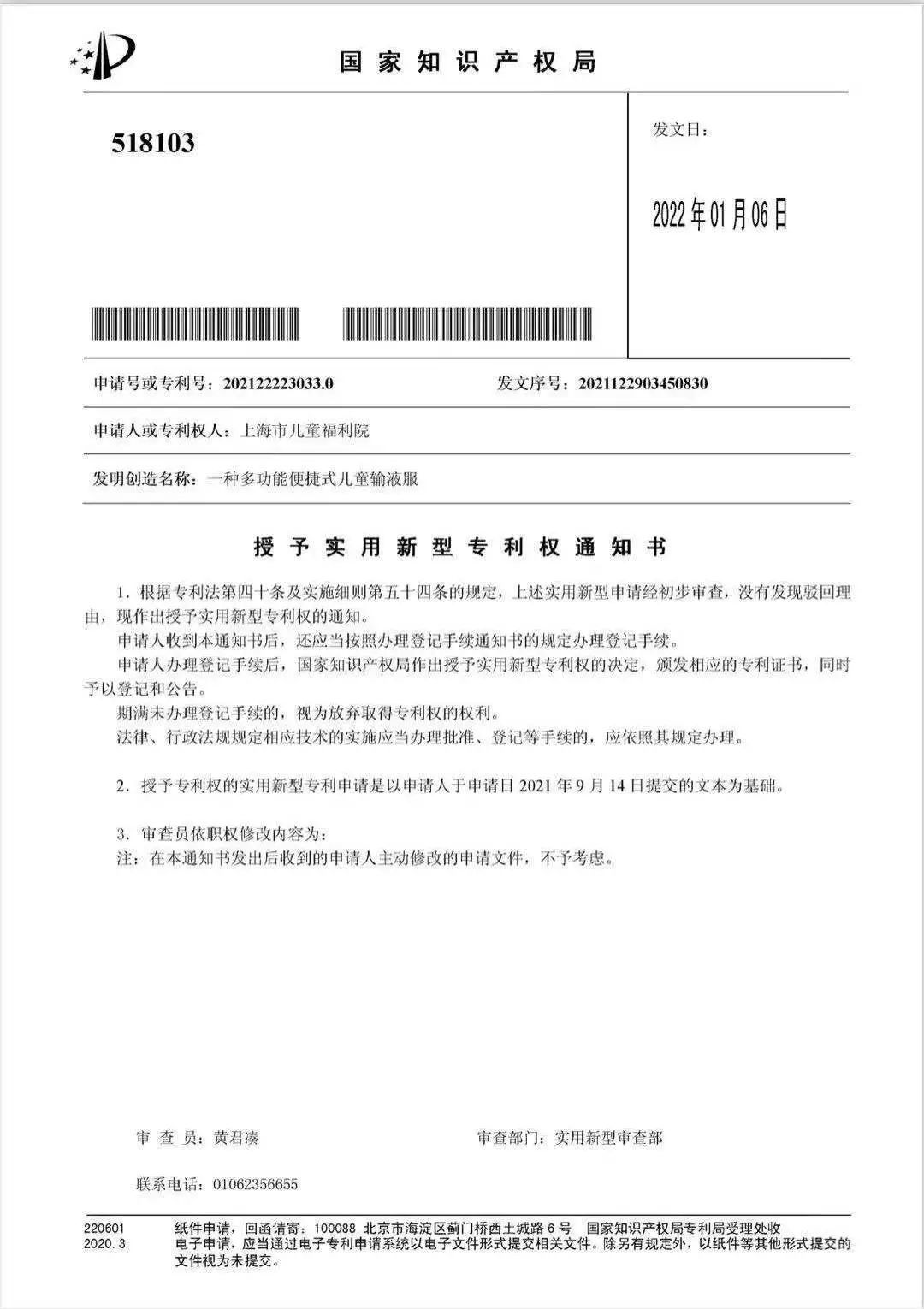 2022年新年伊始,市儿福院护理团队设计的一项儿童辅助用具“隐形的翅膀”儿童输液辅助工具获得国家知识产权局实用新型专利认证。该用具在2021年院开展的“护理巧心思”创想赛中脱颖而出,后续经改良后此次成功获得专利认证。