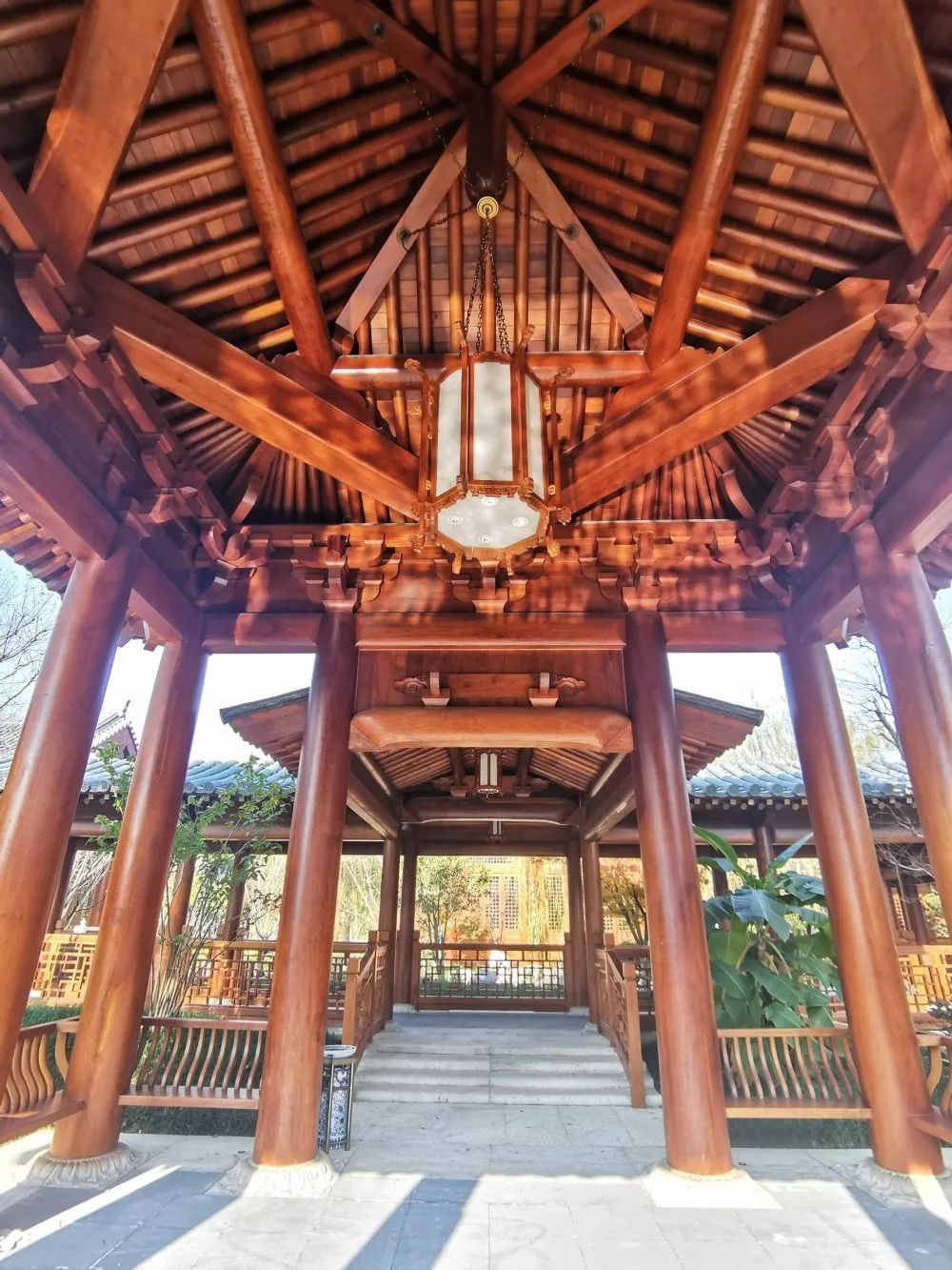沿着进厅、照壁,来到酒店大堂,青花瓷牡丹花的吊灯别具美感,整个大堂可以更清晰地看到榫卯结构建筑。相关负责人告诉记者,全榫卯木结构建筑是中国建筑史上的瑰宝,东平草堂酒店采用缅甸柚木作为建筑原材料,殿、楼、亭、榭,不见一钉,全靠拼接,再现了中国雅宋的盛世风采。