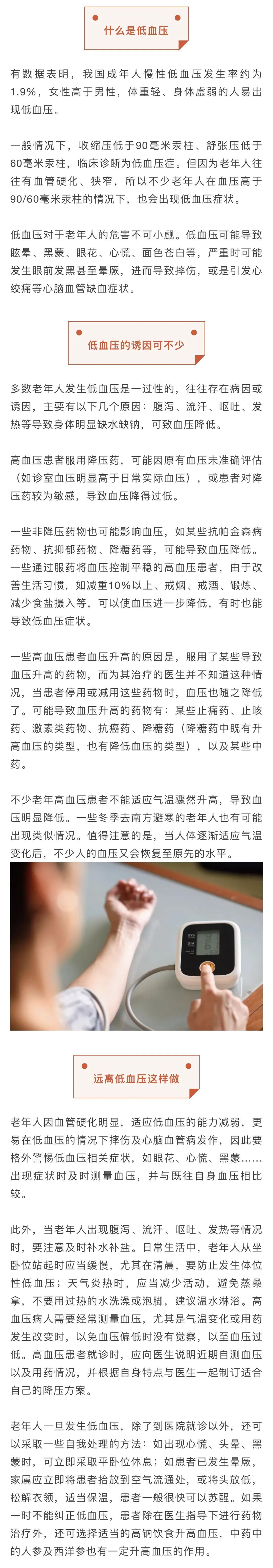 由于高血压是老年人常见的疾病之一,所以,人们非常重视对高血压的防治。其实,在老年群体中,还有一些人正在为低血压所困扰。
