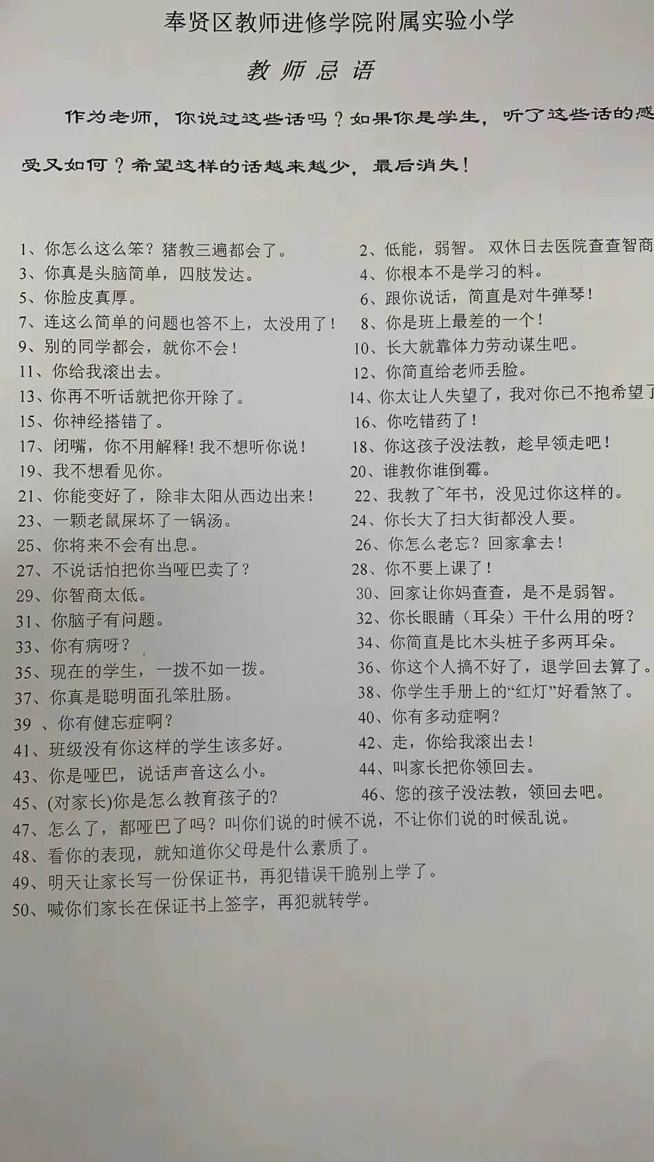 在奉教院附小,所有老师都有一张50句“语言禁区”清单,老师们以此为戒,根据“负面清单”给自己的语言设定红线,杜绝校园里的语言“冷暴力”。