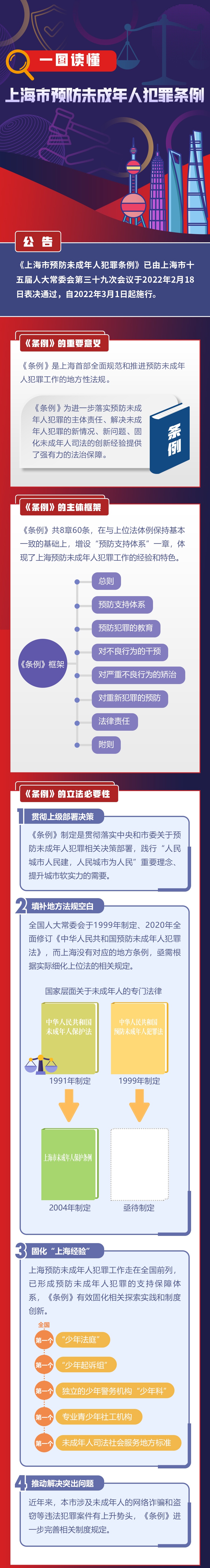 共青团上海市委员会、上海市青少年服务和权益保护办公室介绍,2月18日,《上海市预防未成年人犯罪条例》(以下简称《条例》)经市十五届人大常委会第三十九次会议表决通过,于3月1日施行。《条例》是上海首部全面规范和推进预防未成年人犯罪工作的地方性法规,设总则、预防支持体系、预防犯罪的教育、对不良行为的干预、对严重不良行为的矫治、对重新犯罪的预防、法律责任、附则等共8章60条。详见↓