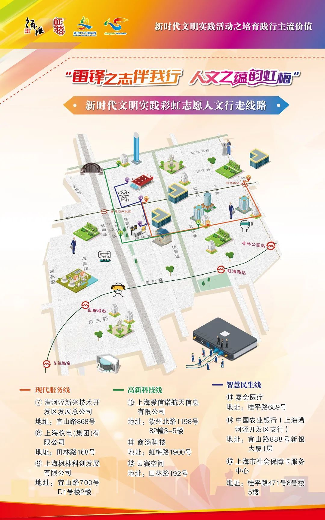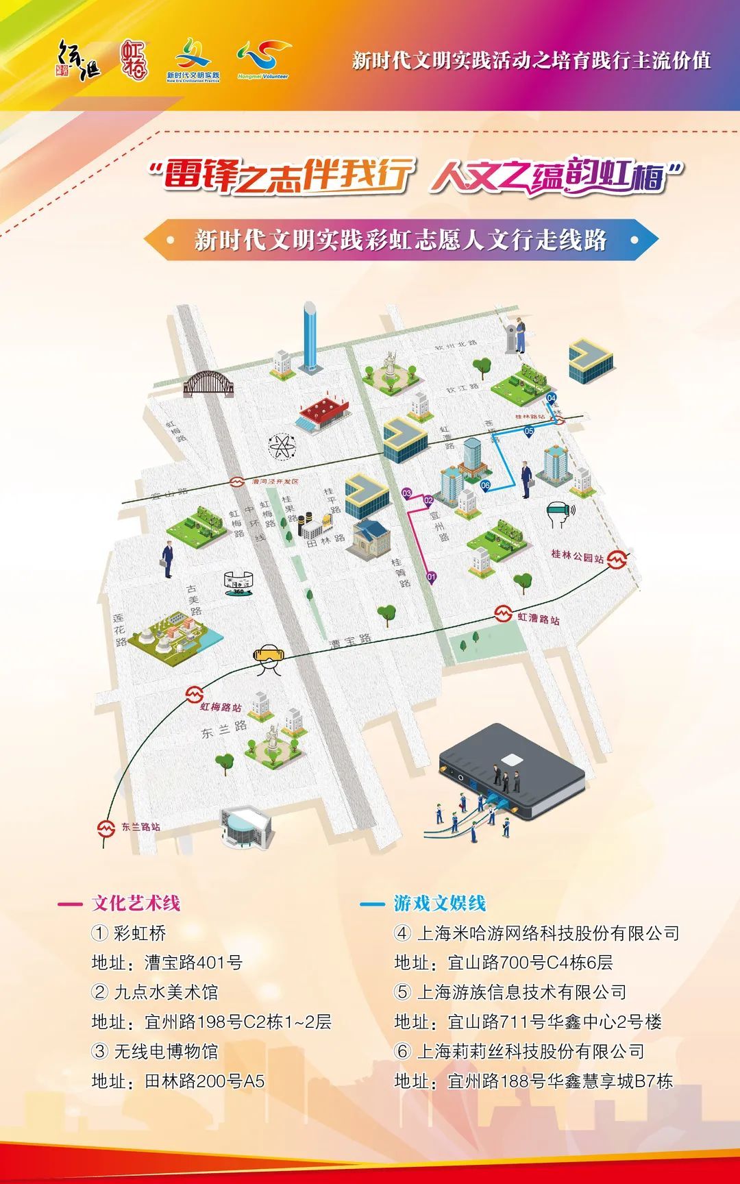 虹梅街道党工委书记范润生,虹梅街道党工委副书记、办事处主任陈黎华,区文明办未成年人思想道德建设科科长滕培玉,九点水美术馆馆长陈君达等发布新时代文明实践“彩虹志愿”人文行走的路线。