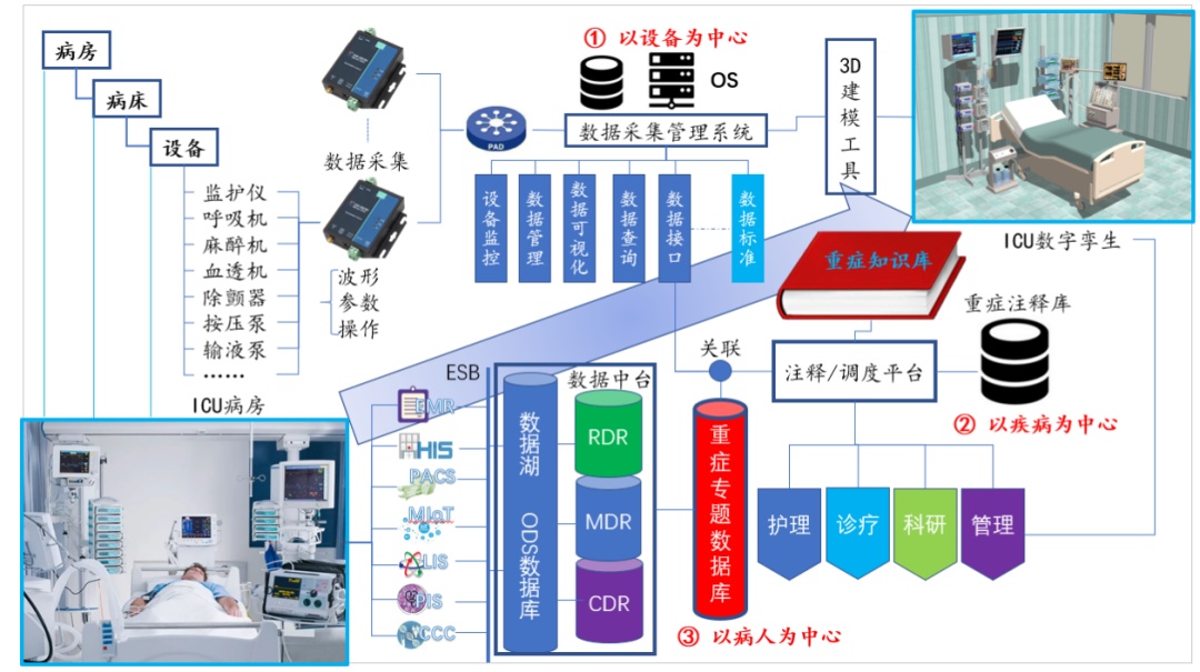 以此为基础,复旦大学附属中山医院正在和相关科技公司深度合作,以数据和知识两大医院核心信息资源为支撑,开发建设新一代“数字孪生重症监护室”。通过空间+时间的4D模式,以可视化、动态化、精准化的信息系统,集成重症数据、传承重症知识、推动重症医学的新发展,进而实现重症数据的全面记录和动态3D可视化,实现重症监护设备、医疗过程、病情发展的模型化、实现重症监护室的虚拟运行和虚实转化,实现重症医学医教研管的一体化发展。