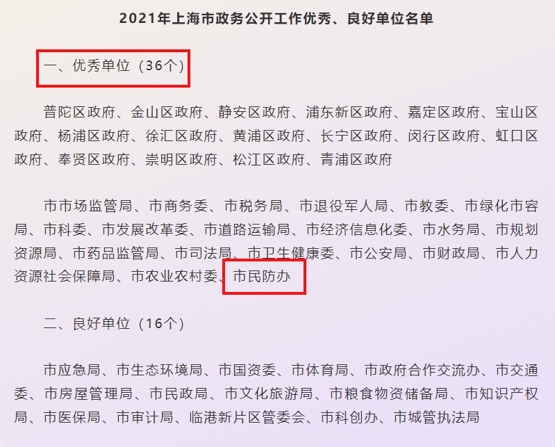 据上海市人民政府办公厅印发的《2021年上海市政务公开工作优秀、良好单位名单》的通知显示,市民防办获评“2021年上海市政务公开工作优秀单位”。