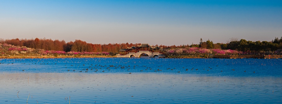 梅园占地面积2000亩,以一湖三岭七道湾为布局。亭台楼榭错落有致,水天一色美轮美奂。