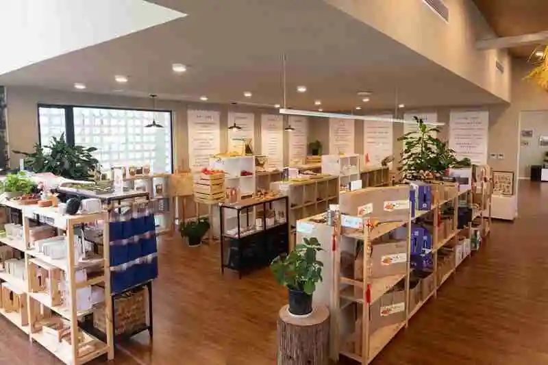 比如,文化空间布置得像城市书店,风格清新美丽,而展览架上摆放的商品和城市里的不同,有列为非遗的手工艺品、当地特色文创产品等。