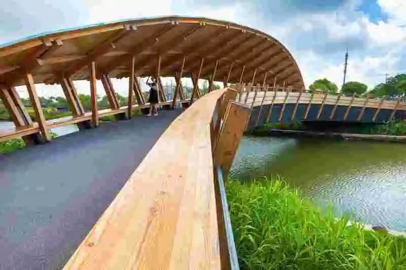 这座桥梁连接了地铁站与田野,也连接了城市与乡村。它有一条漂亮的弧线,仿佛传统拱桥的变形。木质的片板像层层波浪,起起伏伏,两排立柱中设置了公共长椅,有几分江南廊桥的意趣。