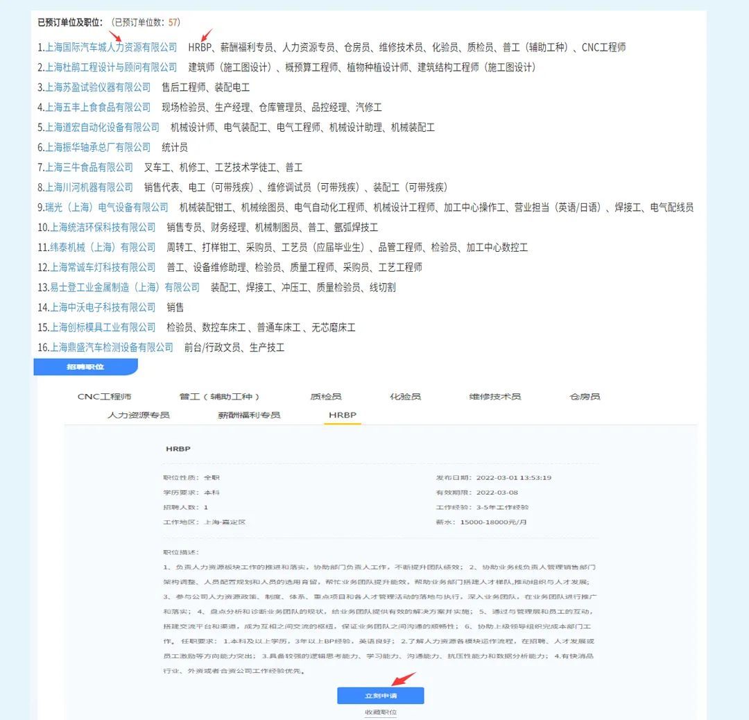 (二)进入嘉定伯乐人才网首页“2022年3月4日-3月9日嘉定人才市场网络招聘会”专题通道点击蓝字单位名称处进入招聘单位进行招聘岗位报名。