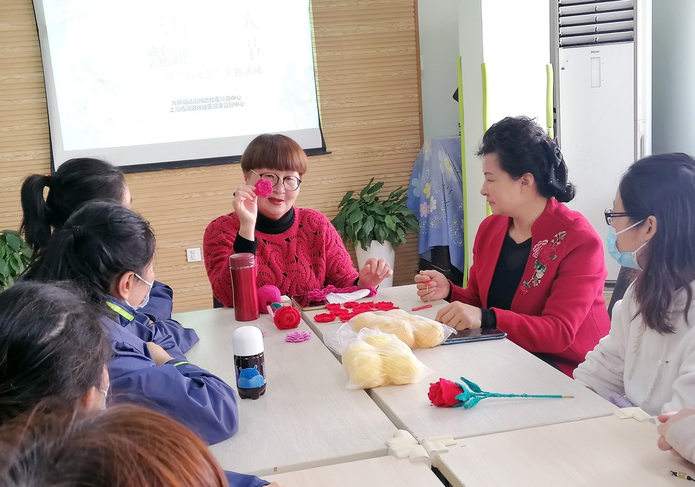 在本次活动中,睦邻中心特别邀请参与冬奥会颁奖花束玫瑰制作的杨浦区巧手妈妈团队杜兆萍老师,带来零基础钩花教学,让每位参加活动的女性代表都能收获一份永不凋谢的浪漫。