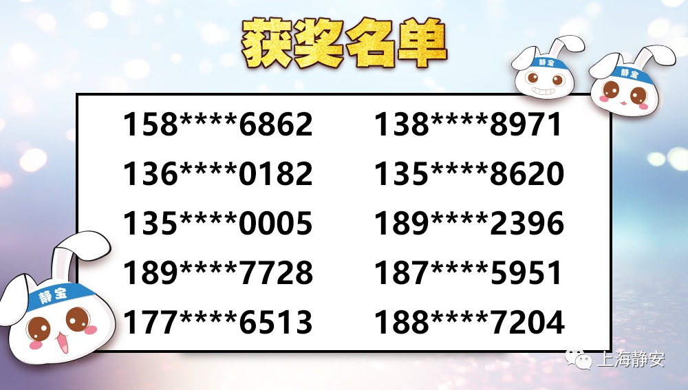 关注“上海静安”微信公众号,在后台回复“互动问题答案+姓名+手机号码+收件地址”(为避免快递派送出现问题,请务必填写正确的联系电话和地址哦),静宝将按照收到的回复顺序,以15为倍数,随机抽取10名幸运粉丝,送出静宝为你定制的帆布袋一个。