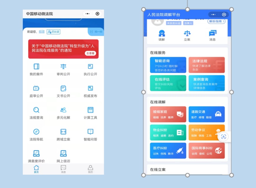 中国移动微法院主界面、多元化解界面