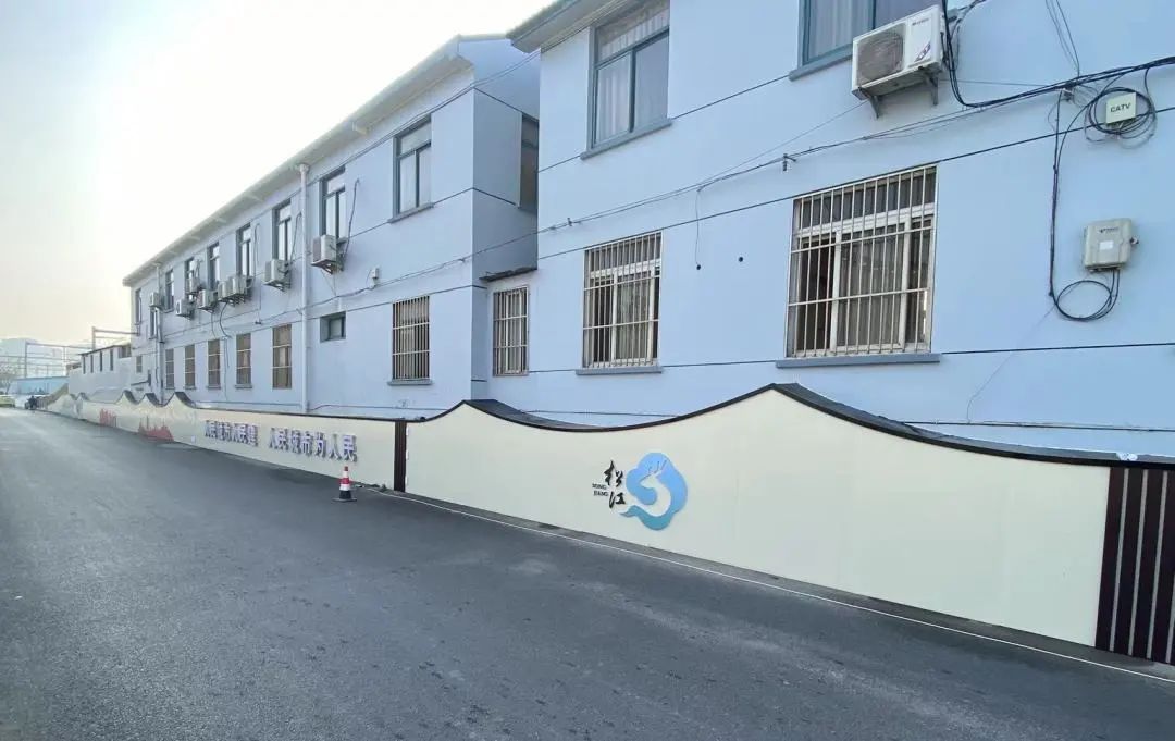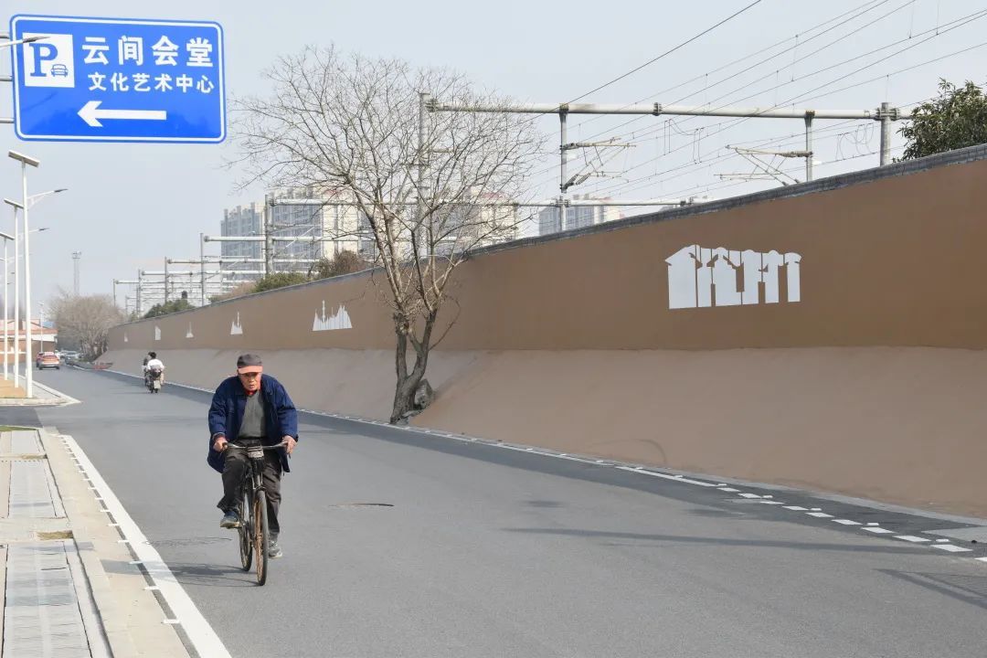 云间会堂文化艺术中心周边的围墙原本是白墙,经美化提升后,与中心建筑物外立面颜色协调,点缀松江地标建筑元素剪影,展现松江的历史文化底蕴,增添街区韵味。