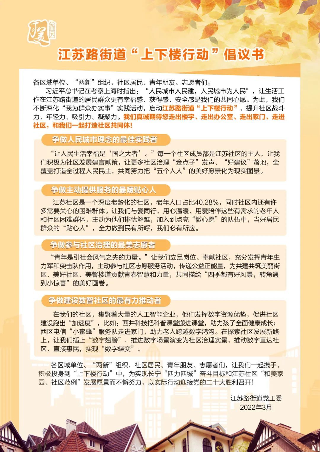 在“上下楼行动”中,街道将充分发挥党建引领基层治理效能,号召各级党组织和党员干部、社区居民、青年朋友、志愿者,以及区域单位、“两新”组织等踊跃加入到“干部下楼、走访上楼”“青年下楼、活力上楼”“数据下楼、慧智上楼”“民声下楼、服务上楼”四方面行动中。