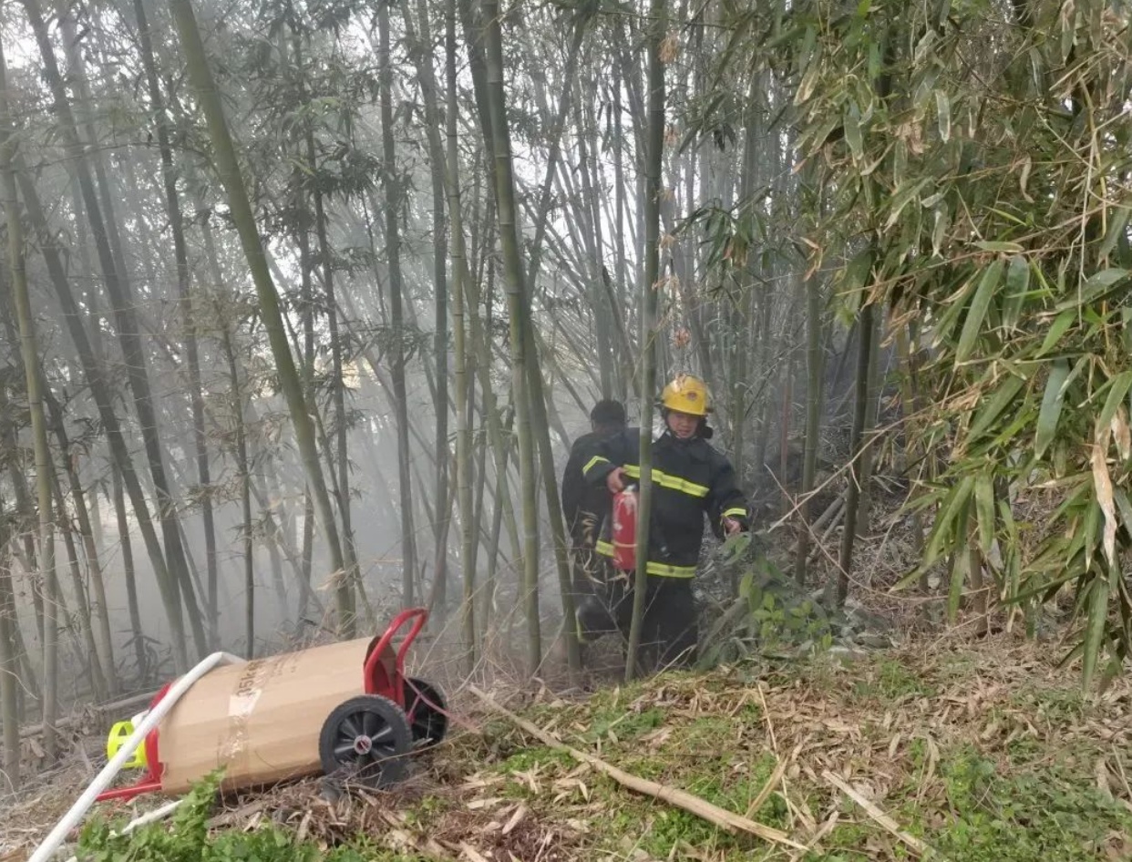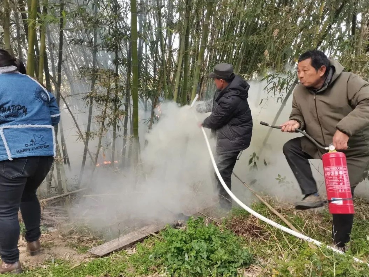 救援现场,微型消防站队员拿起干粉灭火器、水带等设备进行灭火,因救援及时,为防止复燃现象发生,微型消防站队员对现场开展全面浇水将火完全扑灭。事后经调查,是一村民把祭祀的灰烬倒在了张家桥边上的竹林处,遂引起火灾。