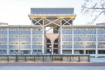 其次是重新诠释了屋顶水箱的空间统领地位。建筑师根据史料复建了在2011年被拆除的屋顶水箱,作为滨江观景厅使用。使用钢结构替代原钢混结构,并增设斜向支撑呼应既有结构形式。借用现有的楼梯和电梯,从而形成从地面至屋顶连续上升的观景流线,成为滨江观览的一个好去处。